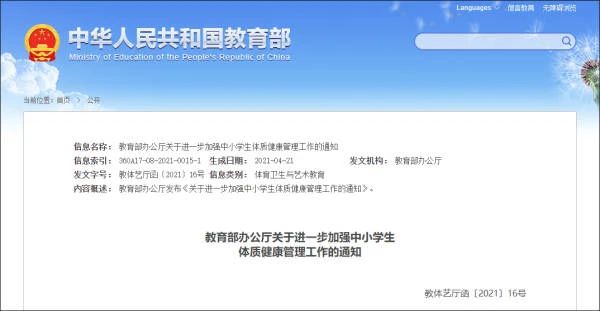 近日,教育部发布《教育部办公厅关于进一步加强中小学生体质健康管理工作的通知》(下称《通知》)。