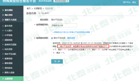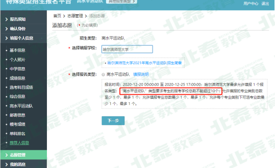 院校如果招的是游泳、足球等国家统测项目,会要求考生在阳光高考网和体教联盟上同时报名,在体教联盟上最多可以填报10个志愿,但是考生需要先查看自己报考的这些院校的招生简章,院校会对志愿数量有要求,例如只能填报2-3个,在阳光高考网上填报志愿时会有相关的提醒: