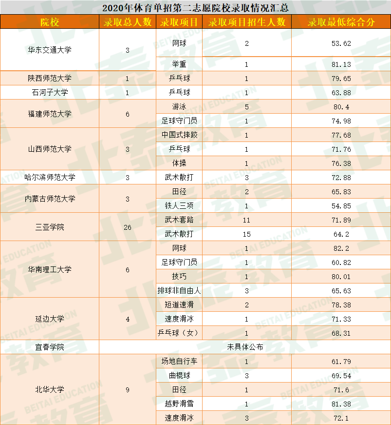 从2020的录取数据来看,有11所院校录取了第二志愿,共录取65人。其中有些是第一志愿没有报满或者过线的人数没有达到招生计划数。这11所院校中,福建师范大学连续四年都录取了第二志愿,其中游泳项目也是连续四年都没有招满第一志愿。而山西师范大学、延边大学、陕西师范大学、内蒙古师范大学这几所院校也连续三年招收了第二志愿。