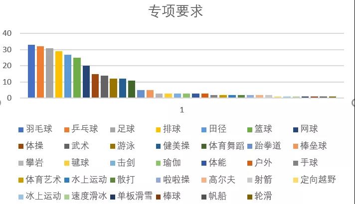 对具中有明确专项要求的高校招聘信息汇总后发现,高校招聘对专项的需求还是很广泛的。其中球类仍是招聘的热点,排名前7位的专项要求中包含了三小球(乒、羽、网)和三大球(篮、足、排),作为运动之母的田径,排名也较前。不仅这些常见的专项被高校所需,像轮滑、啦啦操、攀岩等广受同学们喜欢的项目也被高校所需。值得一提的是,冬季运动项目,如冰上运动、速度滑冰等也走进高校。